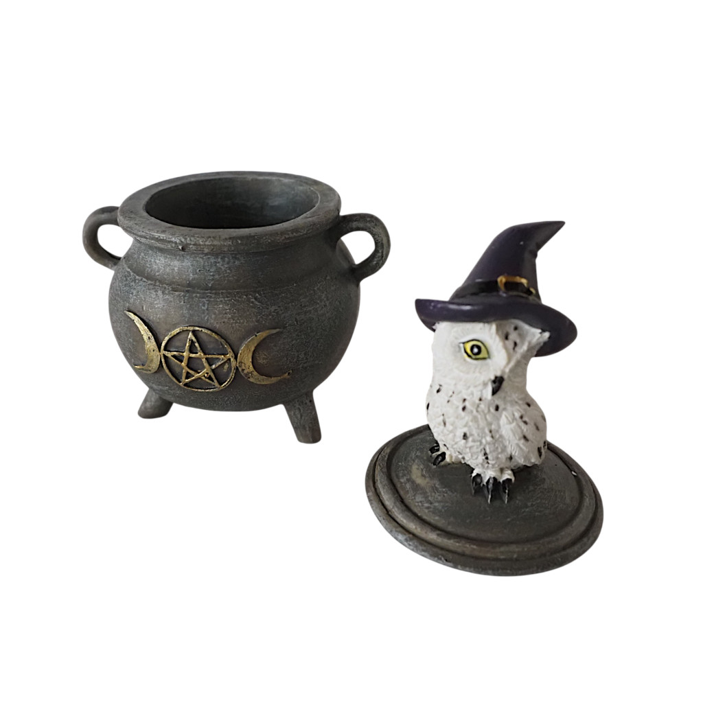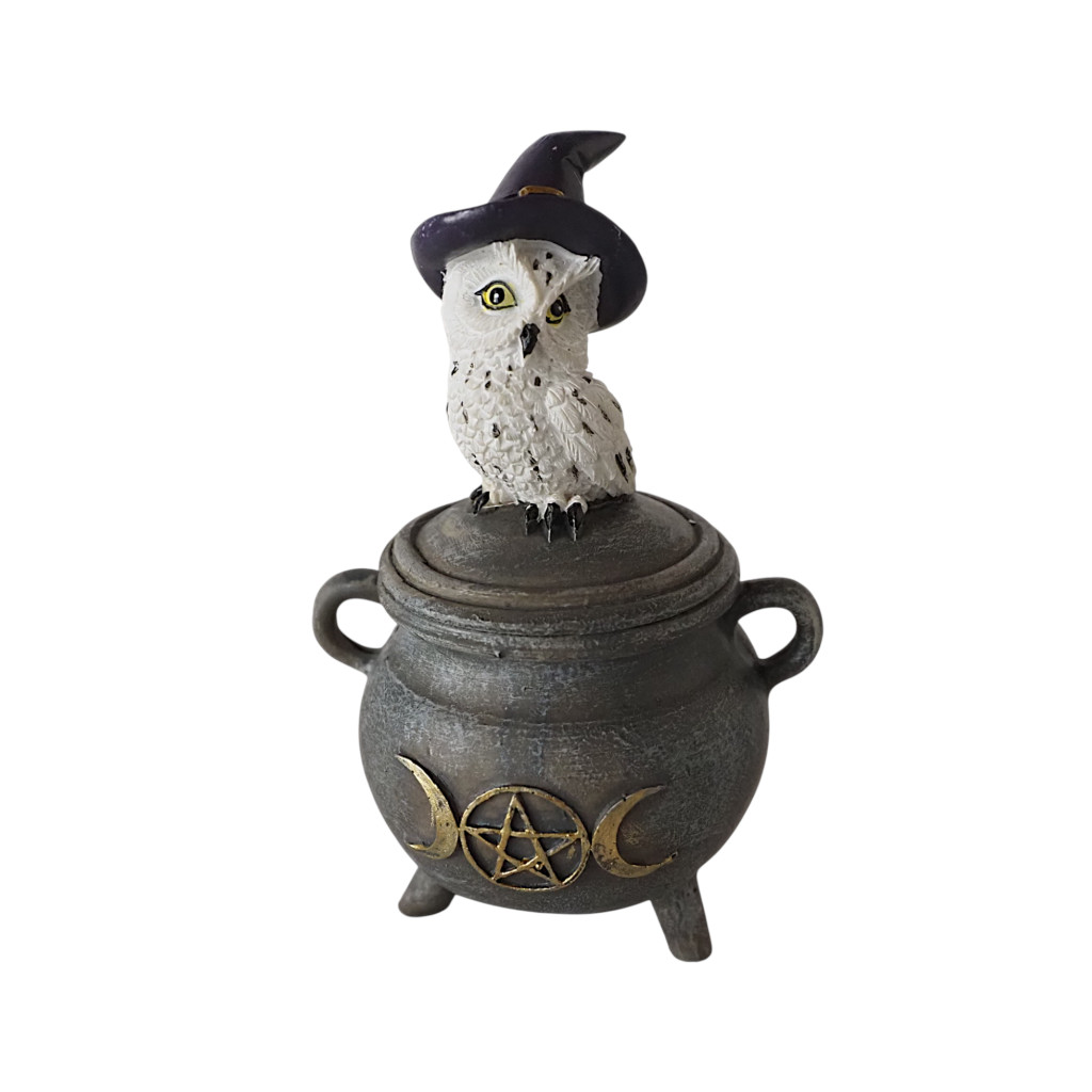 Lila kalapos bagolyka csücsül a boszorkány üstön. Bagyoly imádóknak kifejezetten ajánlott,a Hekaté szimbólummal díszített üst.