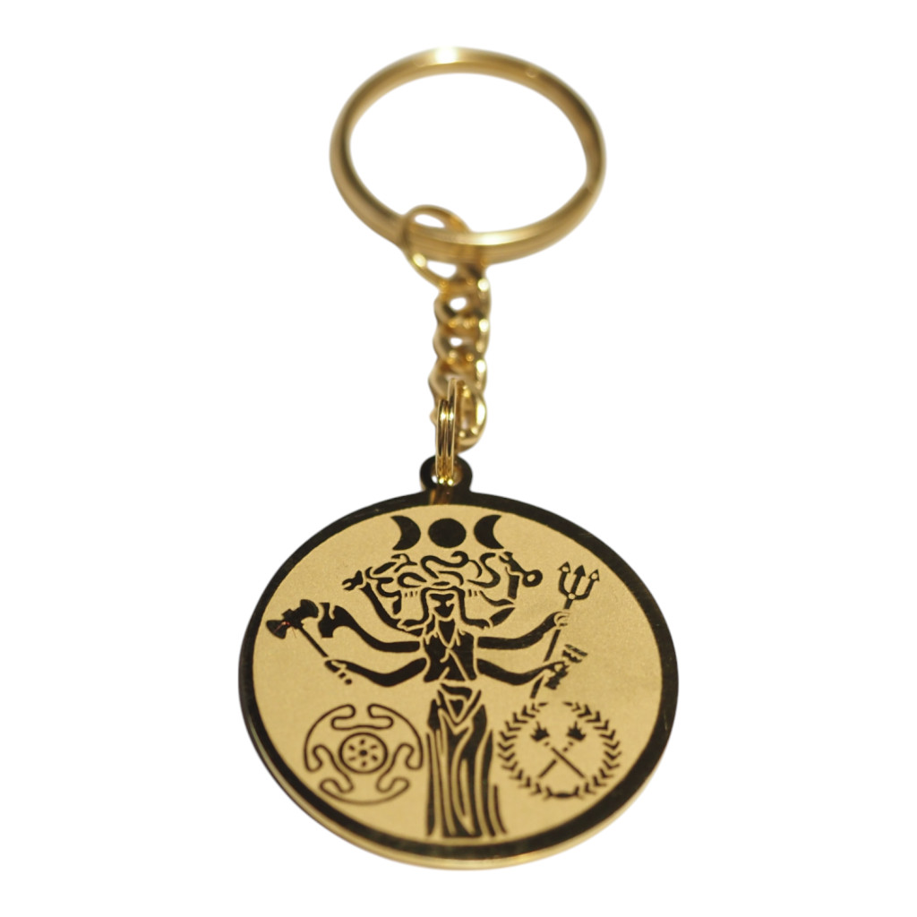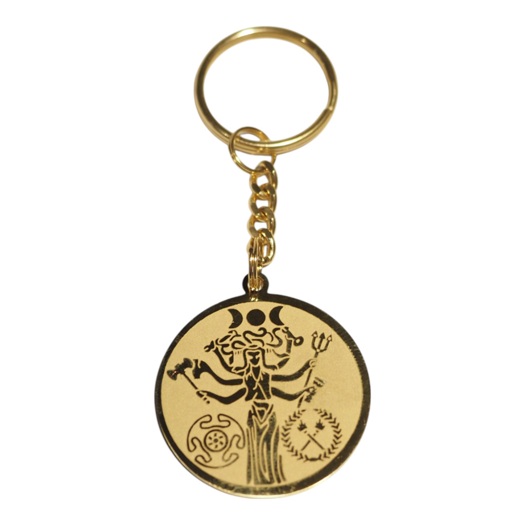 Az istennő többkarú ábrázolása kiemeli hatalmát a világok közötti mozgás képességét. Hekaté kereke szimbolizálja a védelmet.