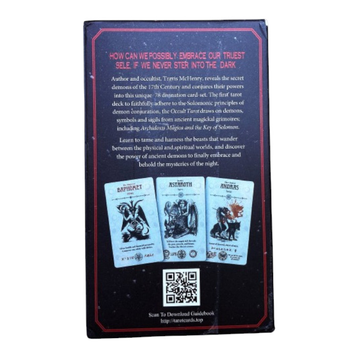 Az Okkult Tarot kártya magába foglalja a démonokat és azoknak az erejét. Arra készteti használóját, hogy megismerje az éjszaka rejtelmeit. Az első tarot kártya, amely hűen betartja a démonok varázslásának salamon elveit, az okkult Tarot lehetővé teszi a gyakorlók számára, hogy felfedezzék az ősi démonok erejét, és megtanulják megszelídíteni azokat a vadállatokat, amelyek a fizikai és lelki világ között vándorolnak.