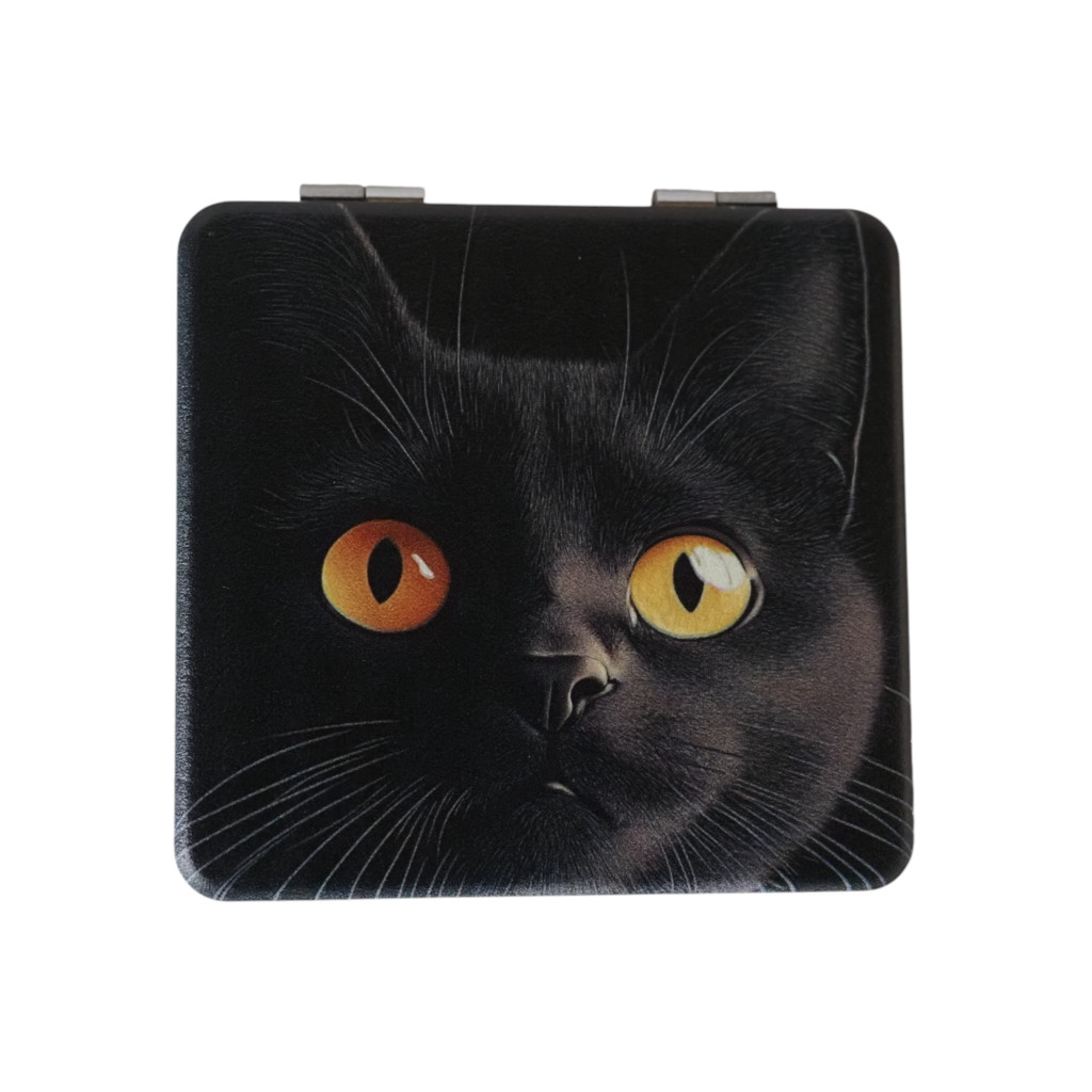 Fekete cicát ábrázoló kétoldalas tükör. Tükörmágiához illetve sminkeléshez használhatod ezt az összecsukható tükröt.