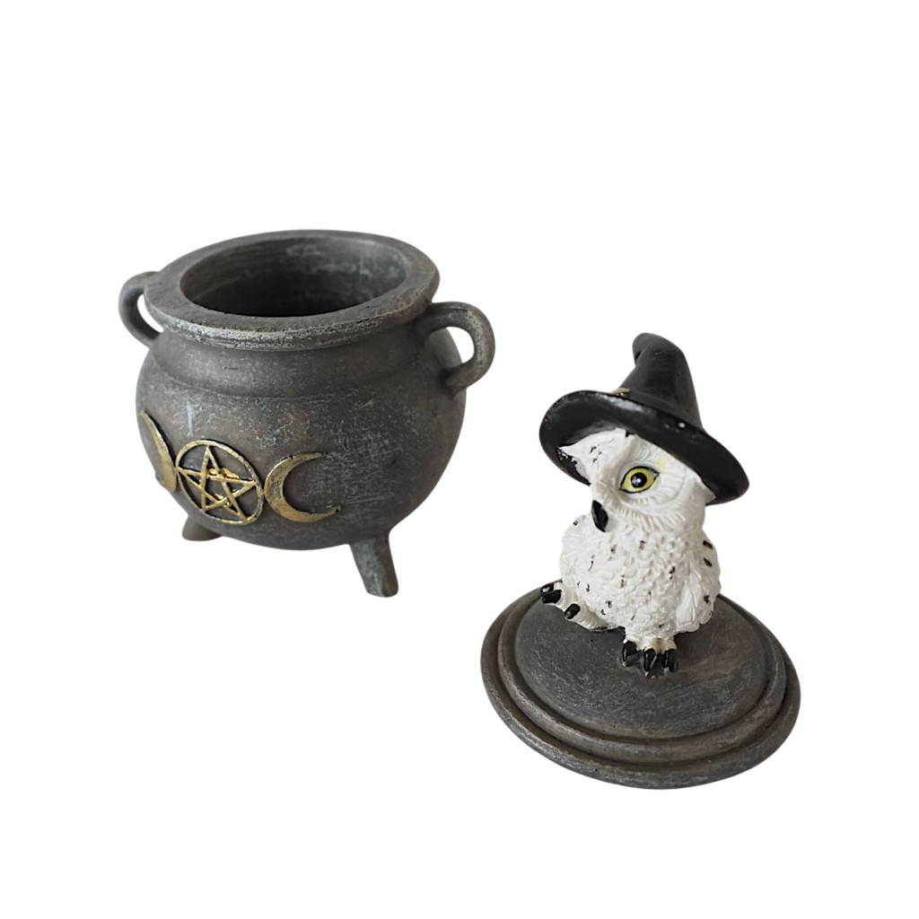 Fekete kalapos bagolyka csücsül a boszorkány üstön. Bagyoly imádóknak kifejezetten ajánlott,a Hekaté szimbólummal díszített üst.